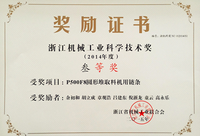 “P500F8圓形堆取料機用鏈條”高端產品獲得浙江機械工業科技獎,是上級部門對東華集團注重科技創新、產品轉型升級的充分肯定和高度褒獎,全面體現了東華集團在中國鏈傳動行業中的技術標桿、行業翹楚地位,也將鞭策東華集團繼續深入開展獲獎科技成果的推廣工作,加速科技成果轉化,為促進機械工業科技進步和中國零部件產業發展做出更大貢獻。