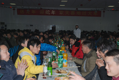 2月6日晚上,東華集團南區、新區的食堂里張燈結彩,一片歡聲笑語,550多名外地留守員工正沉浸在喜迎新春的歡樂氛圍中,這里正在為外地留守員工舉行“同吃年夜飯,歡度除夕夜”活動。