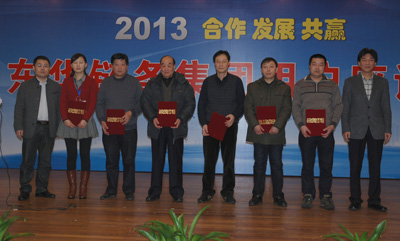 最后,內銷公司總經理戴迪漢分別宣讀了東華集團和盾牌公司2012年優秀經銷商名單,宣碧華董事長向優秀經銷商頒發了榮譽證書并合影留戀。