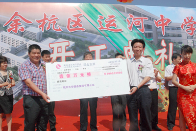 7月3日,烈日炎炎,在運河中學舉行的開工典禮上,東華集團董事長宣碧華熱心參與余杭區(qū)運河鎮(zhèn)組織的“捐資助校·功德千秋”慈善捐贈活動,向運河中學建校捐款100萬元,為“運河中學”建設(shè)項目添磚加瓦,充分體現(xiàn)了東華集團關(guān)心、支持教育事業(yè)的拳拳愛心。