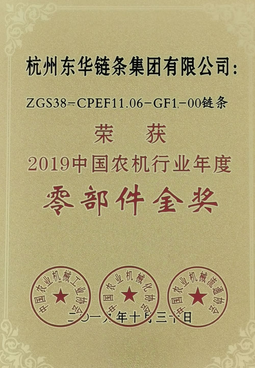 展會期間,舉行了2019中國農機行業年度頒獎典禮,東華生產的ZGS38-CPEF11.06-GF1玉米收獲機用鏈條榮獲2019中國農機行業年度零部件金獎”,是鏈條行業唯一獲此殊榮的產品,是中國農機行業的最高榮譽。該產品具有結構新,用途巧等特點,是東華近年來研發的高端鏈條產品。