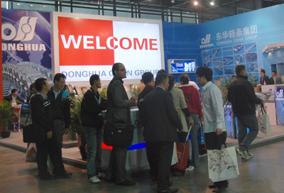 本屆展會上,東華與2009年收購的德國百年企業KOBO鏈條公司同臺展出,展臺占地120多平方米,設計美觀、大氣,樣品、資料豐富齊全,整個展臺突出體現了“DONGHUA”、“KOBO”的品牌。展臺上半數樣品專程從德國KOBO公司運送到上海亮相,其精良的德國制造產品和東華的自主品牌產品吸引了無數國內外客戶的眼光。東華由外貿開發處處長胡春暉帶隊的業務員每天忙著接待國內外新老客戶,向客人們介紹東華鏈條產品質量及發展態勢等信息,聽取客戶的意見和建議。