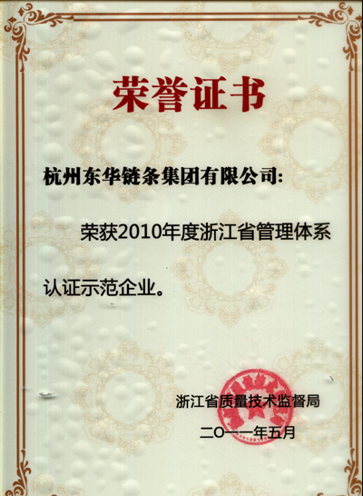 通過對質(zhì)量管理體系的認證,規(guī)范了企業(yè)的管理,取得了一定的成果,此次被浙江省技術(shù)監(jiān)督局授予“2010年度浙江省管理體系認證示范企業(yè)”稱號,充分說明企業(yè)在質(zhì)量管理方面取得的成果,并得到了省級機關(guān)的認可。
