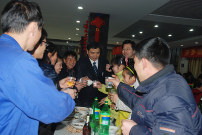 席間,總經理張世強冒著雨雪天氣,奔波兩個生產廠區,向每一個員工表達了新春的問候,同時,對員工們為東華的發展付出的辛勤勞動表達了感激之情。期間,張總向每一桌員工送酒,向每一個員工敬酒,對留守員工表示親切慰問,噓寒問暖。大家在同吃年夜飯,同喝喜慶酒,同吃餃子、同慶佳節之際,促進了彼此的交流、增強了彼此的感情。