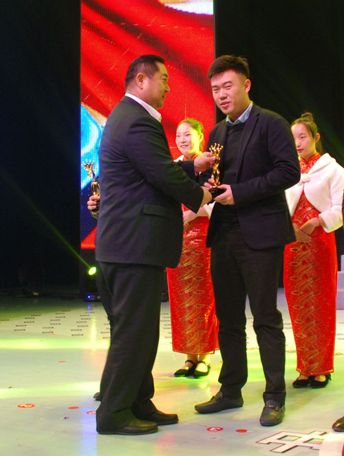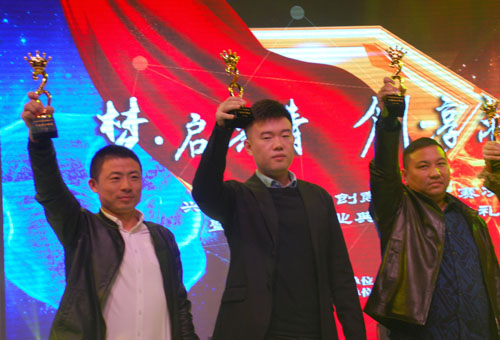 副董事長(zhǎng)宣成(中)與其他十佳創(chuàng)業(yè)明星高興獎(jiǎng)杯