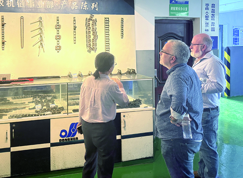 首先,HCA客戶一行深入生產車間參觀。表示東華寬敞明亮的車間、自動化設備高效運轉、員工操作嫻熟以及井然有序的生產場景給他們留下了深刻印象。客戶細致觀摩了從原材料進廠、零件沖制、熱處理到最終裝配檢驗的完整生產流程,尤其對88K等系列銷合鏈的關鍵工序、質量控制點及所采用的先進生產工藝表現出濃厚興趣,并就具體細節與現場技術人員交流,同時對東華農機鏈嚴謹的工藝管理、精良的制造裝備與嚴格的質量控制體系表示高度認可。
