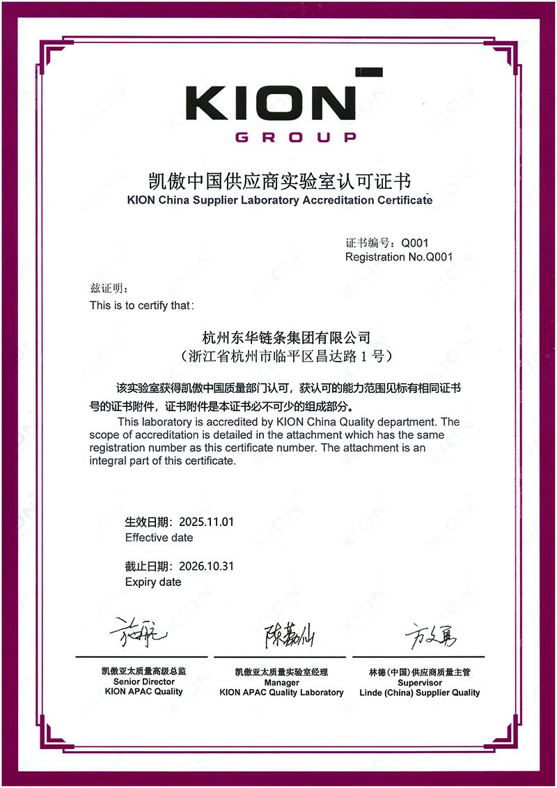 本次審核中,東華鏈條多部門協同準備,最終順利通過認證,不僅體現了東華鏈條在行業內的技術領先地位與實驗室優勢,也為雙方繼續深化合作、拓展新產品與市場份額奠定了堅實基礎。未來將繼續以高質量標準與專業能力,與凱傲集團攜手推進更多合作,共創共贏新局面。