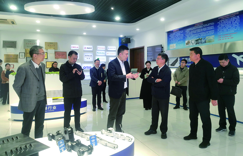 在東華鏈條展廳,調研組觀看了企業宣傳片,并參觀了配套于各行業的高端鏈傳動產品。宣成向調研組詳細介紹了東華鏈條的全球研發制造布局、國內外市場拓展、智能制造、精細化管理、人才隊伍建設以及未來發展規劃。